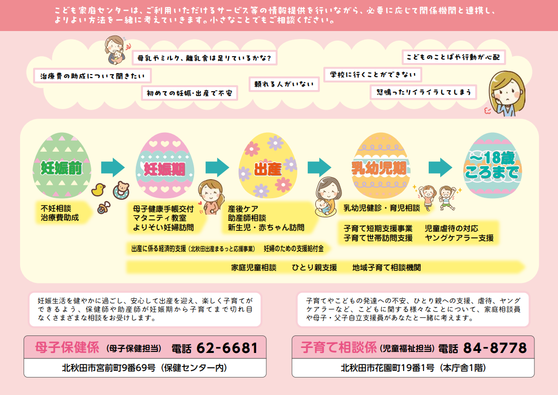 北秋田市は、すべての妊産婦、子育て世帯、こどもに関する様々な相談や困りごとに対し、関係機関と連携・協力して切れ目のない相談支援を行うため「北秋田市こども家庭センター」を保健センター内に設置しました。子育てのスタートにあたる妊娠~出産~乳幼児期を穏やかに過ごせるよう、保健師・助産師などの専門職員がサポートいたします。